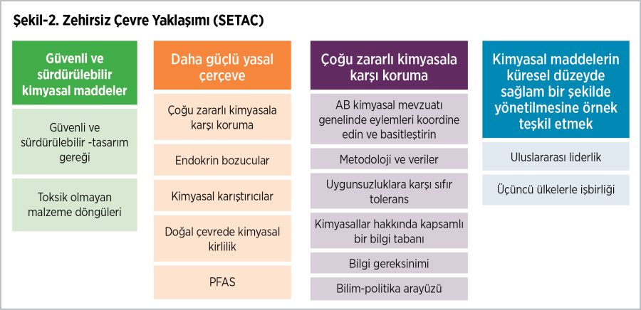 “Toksik olmayan bir çevre, kimyasal kirlilikten ve insan sağlığına ve çevreye zararlı seviyelerde tehlikeli kimyasallara maruziyetten uzak bir çevre olarak anlaşılmalıdır. Bu hedef, savunmasız gruplara mümkün olduğunca fazla koruma sağlama, maruziyet ve hastalık ifadesi arasındaki potansiyel gecikmeleri hesaba katma, Döngüsel Ekonomi’nin bir parçası olarak öngörülen malzeme akışlarının kalitesini sağlamak için çok kalıcı maddelerin birikmesini önleme ihtiyacını dikkate alacaktır.”