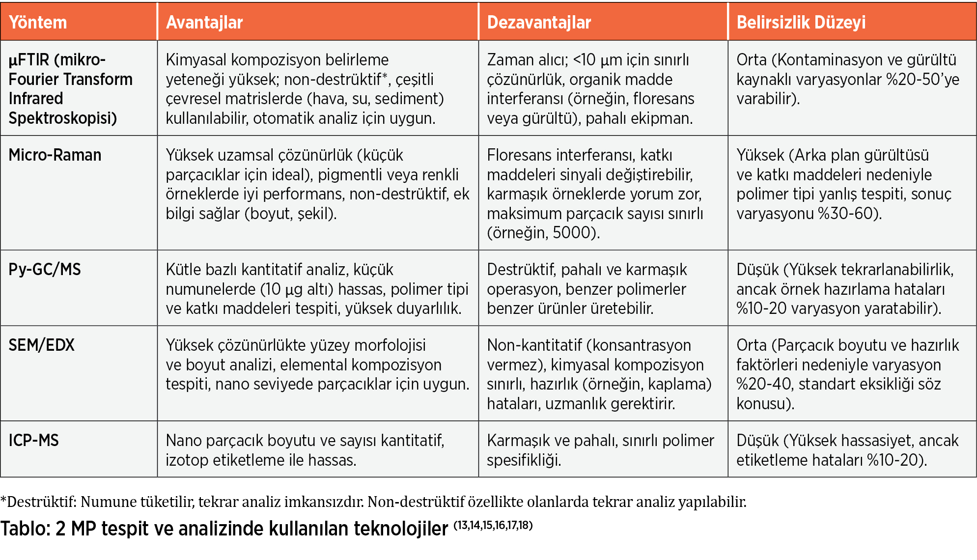 Hava, su, sediment ve biyolojik örneklerde MP tespiti için kullanılan başlıca yöntemler FTIR Spektroskopisi (μFTIR, Hyperspectral FTIR), Raman Spektroskopisi (Micro-Raman), Piroliz-GC/MS (Py-GC/MS), Tarama Elektron Mikroskobu (SEM/EDX), İndüktif Eşleşmiş Plazma Kütle Spektrometresi (ICP-MS) olarak sıralanmaktadır. Bu yöntemlerin birbirlerine göre üstünlükleri ve zayıf yönleri bulunmaktadır.