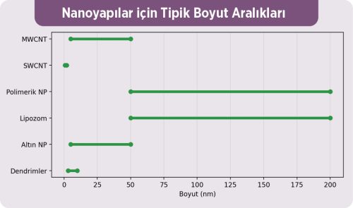 Şekil 1. Nanoyapılar için tipik boyut aralıkları (dendrim, altın NP, lipozom, polimerik NP, CNT)