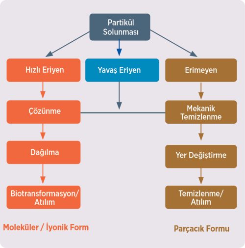 Solunan partikül halindeki NaCl’nin temizlenmesi, hızlı çözünme ile başlar ve ardından çözünmüş iyonların emilimi ve atılımı gelir. ZnO’nun temizlenmesi başlangıçta mekanik yollarla ve çözünme yoluyla gerçekleşirken, TiO2’nin temizlenmesi biyolojik sıvılardaki sınırlı çözünürlüğü nedeniyle neredeyse tamamen mekanik yollarla gerçekleşir (Bermudez vd., 2004). Deniz tuzu maruziyetinin fiziksel formu, biyolojik etkiler açısından büyük ölçüde önemsizdir, çünkü hemen iyonik bileşenlerine ayrışır; TiO2’nin etkileri ise öncelikle fiziksel formuna bağlı olacaktır. Solunan ZnO’nun potansiyel etkileri, partikül etkilerinin (başlangıçta) ve çözünme sonucu oluşan iyonize Zn formunun etkilerinin bir karışımı olacaktır. Bu nedenle, çözünürlük ve çözünme hızının dikkate alınması, boyuta bağlı parçacık etkileri gösterme potansiyeline sahip malzemeler ile etkileri başlangıçtaki fiziksel parçacık biçimlerinden bağımsız olarak moleküler biçimden kaynaklanan malzemeler arasında ayrım yapmada önemlidir.
