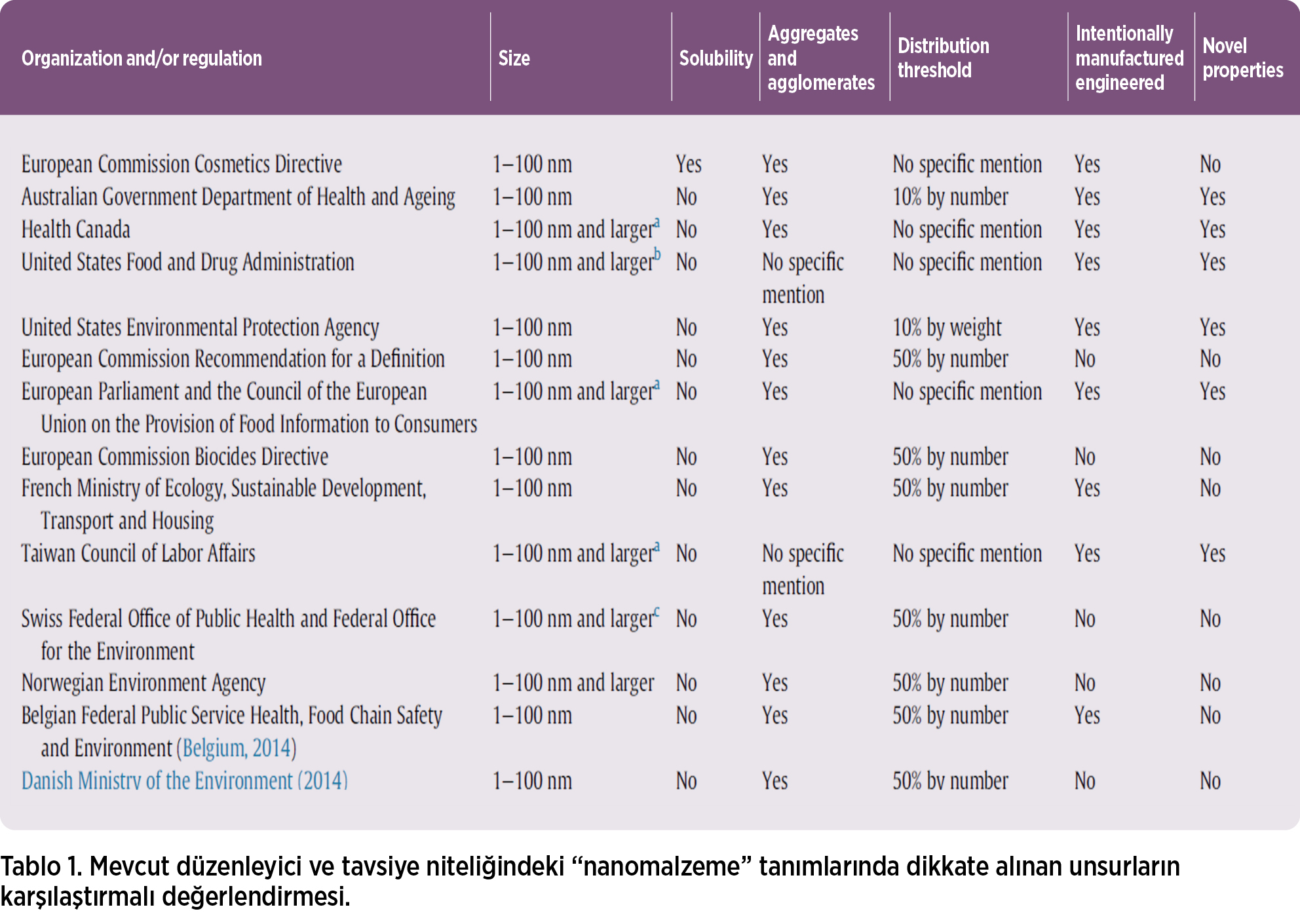 a.Kanada Sağlık Bakanlığı, Avrupa Komisyonu (gıda ve gıda ile temas eden malzemeler için) ve Tayvan Çalışma Konseyi, bir veya daha fazla nano ölçekli özellik/fenomen sergilemeleri durumunda, tüm boyutlarda nano ölçekten daha büyük malzemelerin dahil edilebileceğini belirtmiştir.