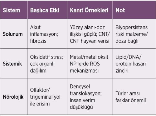CNT/CNF maruziyetinde hayvan modellerinde inflamasyon ve fibrozis güçlüdür; MWCNT‑7 tipi IARC Grup 2B (muhtemel kanserojen) olarak sınıflandırılmıştır. Biyopersistans malzeme/doza bağlıdır; nikel oksit NP’lerde akciğer yarı‑zamanlarının aylar ölçeğinde olabileceği rapor edilmiştir. NP’ler dolaşıma geçerek karaciğer, dalak, böbrek ve beyin gibi organlara dağılabilir; nörolojik erişim için burun–beyin (olfaktor/trigeminal) yollar deneysel olarak gösterilmiş olsa da insanda klinik önemi konusunda belirsizlik sürmektedir.