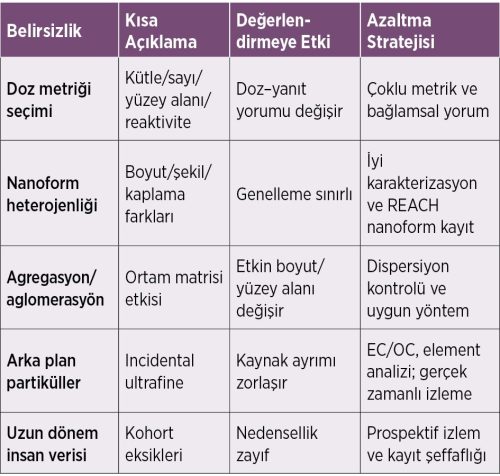 Tek bir metrik bütün ENM’ler için yeterli değildir. Pratikte parçacık sayısı (PNC; CPC/SMPS), kütle (gravimetri/elemental), yüzey alanı ve morfoloji/kimya (TEM/SEM, ICP‑MS) birlikte kullanılmalıdır. Cihazların dinamik üst sınırları, arka plan UFP ile karışma, kişisel örneklemedeki lojistik kısıtlar ve metot standardizasyonu önemli belirsizlik kaynaklarıdır. Proses‑spesifik örnekleme ile mühendislik kontrollerinin etkinliği doğrulanabilir. İnsan uzun dönem verisi sınırlıdır; işçi kohortlarında prospektif izlem ve çoklu metrikli doz–yanıt analizlerine ihtiyaç vardır. Saha ölçümlerinde arka plan partikülleri kaynak ayrımını zorlaştırı. Düzenleyici uyum için REACH nanoform kayıtları ve WHO/ISO rehberleri kritik önemdedir.