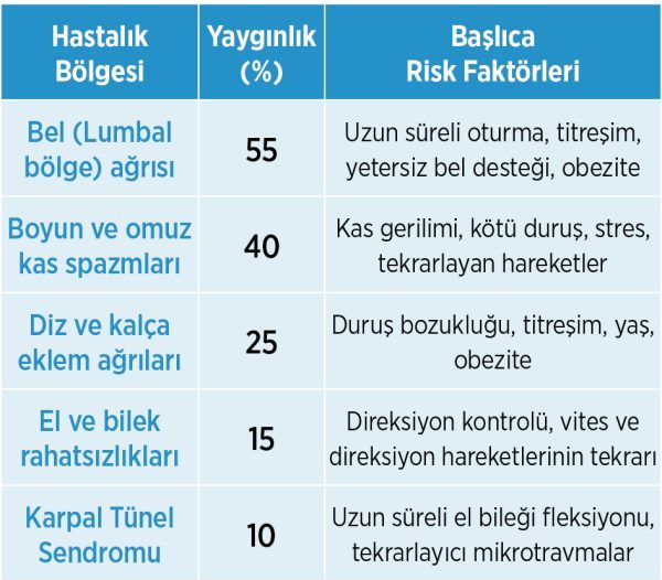 Aşağıdaki tablo, profesyonel şoförlerde sık görülen kas ve iskelet sistemi rahatsızlıklarını ve tahmini yaygınlık oranlarını özetlemektedir;
