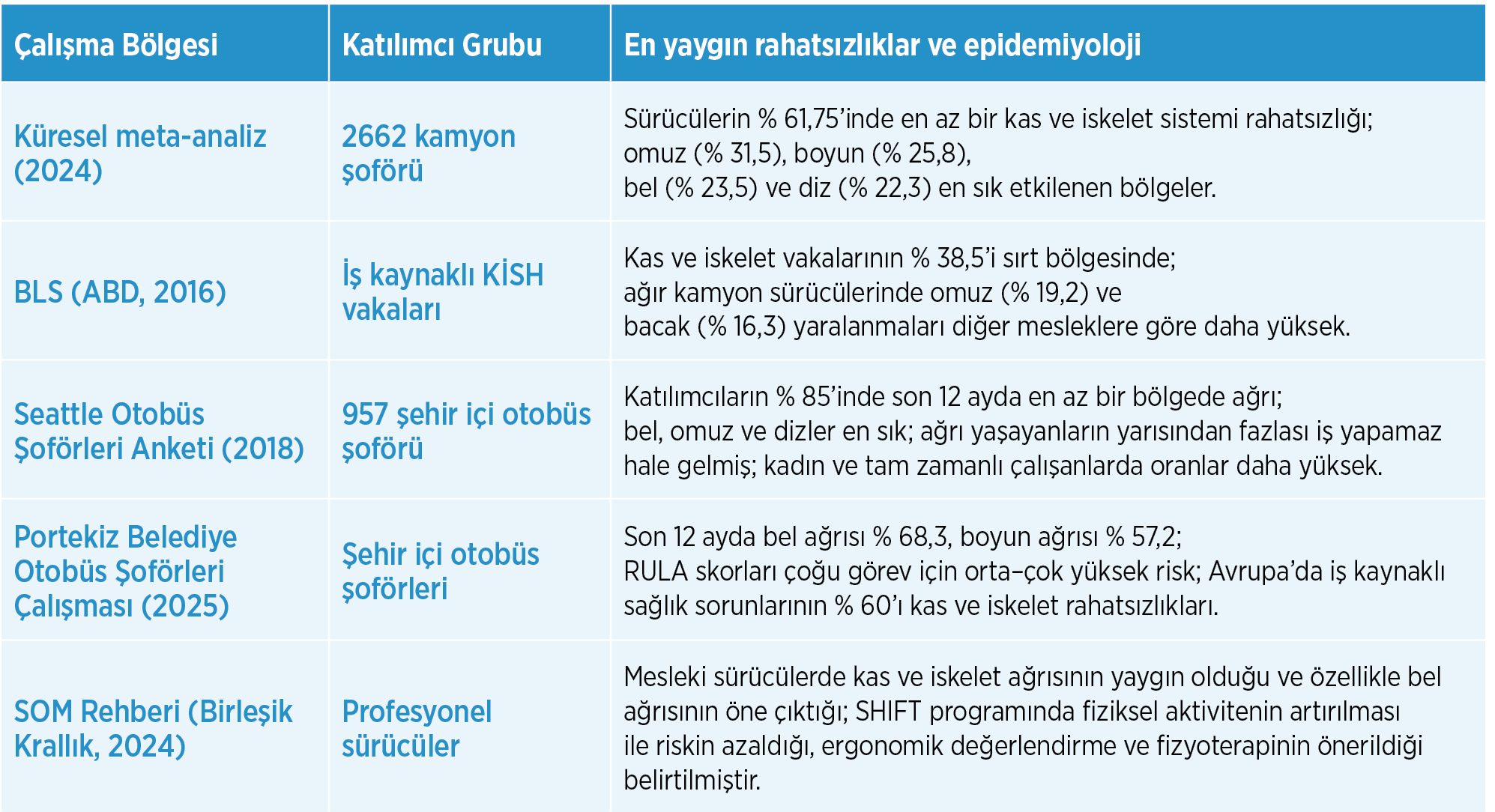 Çeşitli coğrafyalardan gelen bulguları karşılaştırmak amacıyla aşağıdaki tabloda kas ve iskelet sistemi rahatsızlıklarının farklı sürücü gruplarında görülme sıklıkları özetlenmiştir;
