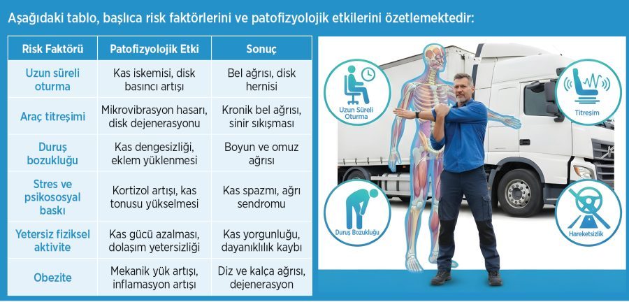 Profesyonel şoförlerde kas ve iskelet sistemi hastalıklarının gelişimi multifaktöriyel bir süreçtir. Çalışma ortamı, fiziksel maruziyetler, ergonomik koşullar, psikososyal stresörler ve bireysel yatkınlık faktörleri bu sürecin temel belirleyicileridir.