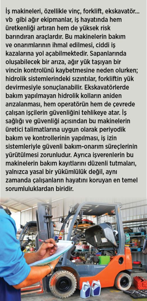 İşverenlerin araç bakım ve onarım süreçlerini takip etmesi, bu süreçleri profesyonel kadrolar ile yönetmesi bir iş sağlığı ve güvenliği gerekliliğidir. Şoförlerin ya da operatörlerin kendi kendilerine bakım yapmasına izin verilmemeli, görev tanımlarının dışına çıkarak riskli işlere yönelmeleri engellenmelidir. Böylelikle hem çalışanların güvenliği korunacak hem de araçların sorunsuz bir şekilde görevlerini yerine getirmesi sağlanacaktır.
