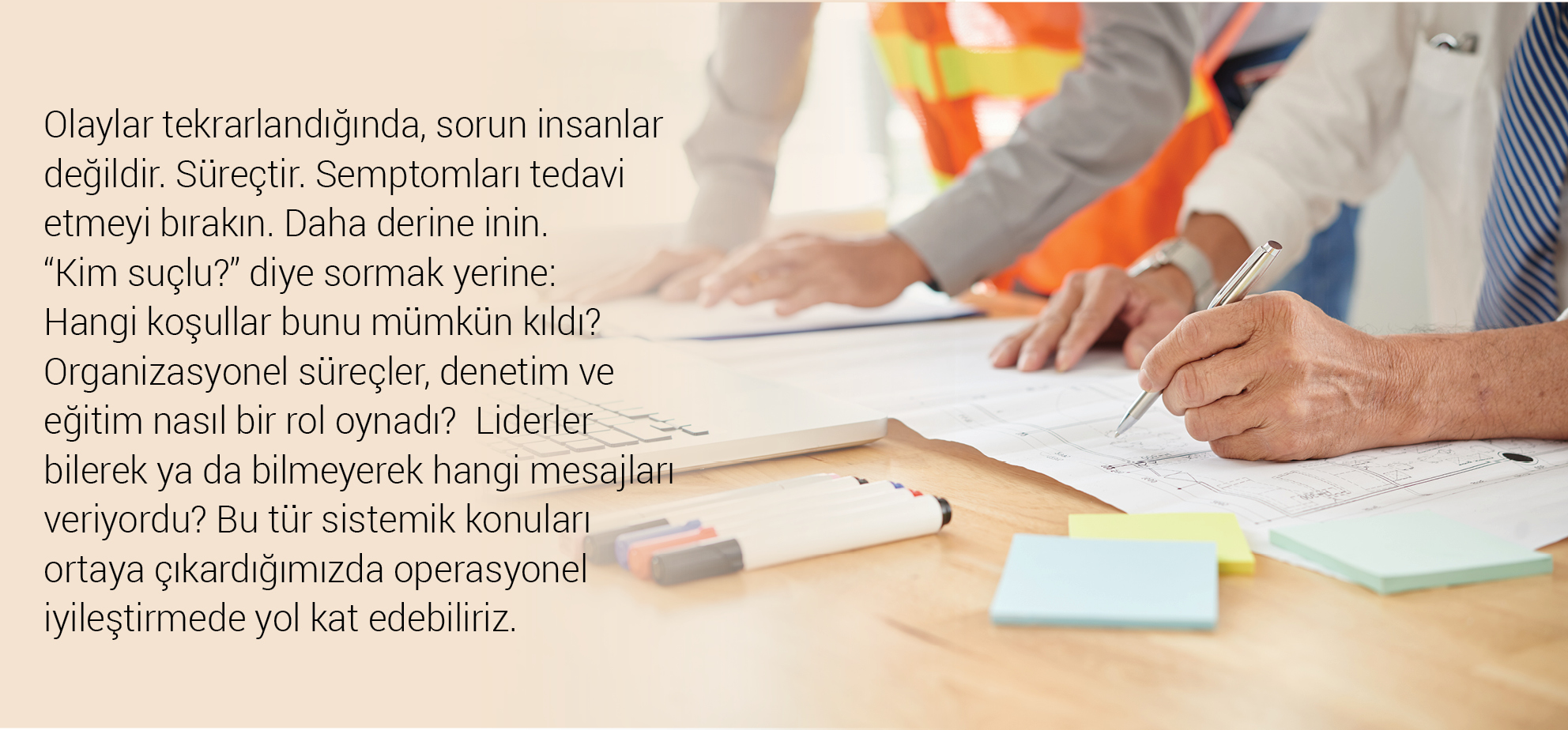 Düzeltici aksiyonlarda Organizasyonel faktörler (örn: çelişen öncelikler, belirsiz prosedürler, zaman baskısı gibi) ve eksik/başarısız savunmalar (örn: iş izni yok/eksik, denetim/gözetim kötü, fiziksel bariyer noksan) a odaklanmamız gerek. Aksiyonlarda insanları suçlamak yerine herkesin içinde çalıştığı sistemi iyileştiriyoruz. Düzeltici faaliyetleriniz sistemin neden buna izin verdiğine dokunmuyorsa, nedenleri değil semptomları düzeltiyorsunuz demektir. İnsanlar hikâyenin bir parçasıdır, ancak düzeltme yapıda yaşar.