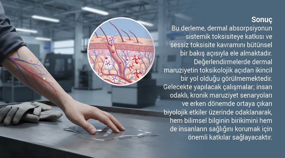 Bu derleme, dermal maruziyetin önemsiz veya ikincil bir yol olarak değil, sistemik ve sessiz toksisitenin kritik bir belirleyicisi olarak değerlendirilmesi gerektiğini vurgulamaktadır. Önleyici stratejilerin, düzenleyici denetimin ve gerçekçi kronik maruziyet senaryolarına odaklanan araştırmaların güçlendirilmesi, halk sağlığının korunması için gereklidir.