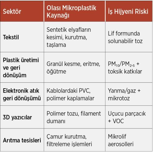 Tablo-1. Mikroplastik Kaynakları: İş Hijyenine Konu Olabilecek Endüstri Örnekleri